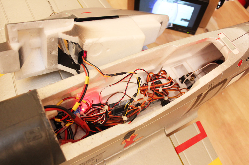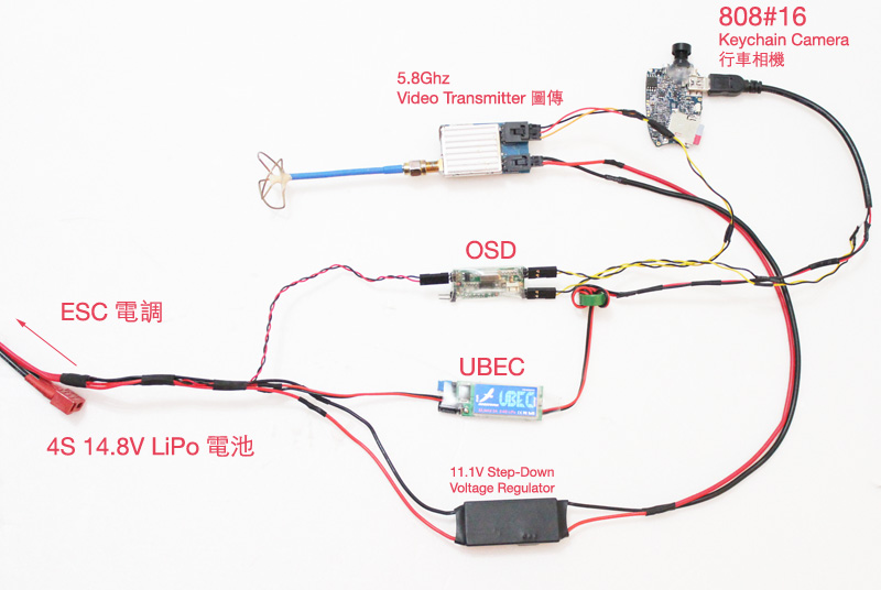 由於飛機是用 4S 14.8V 電,所以要用 UBEC 把 14.8V 穩壓到 5V 給 808#16 使用。圖傳則用 12V 的圖傳變壓器。